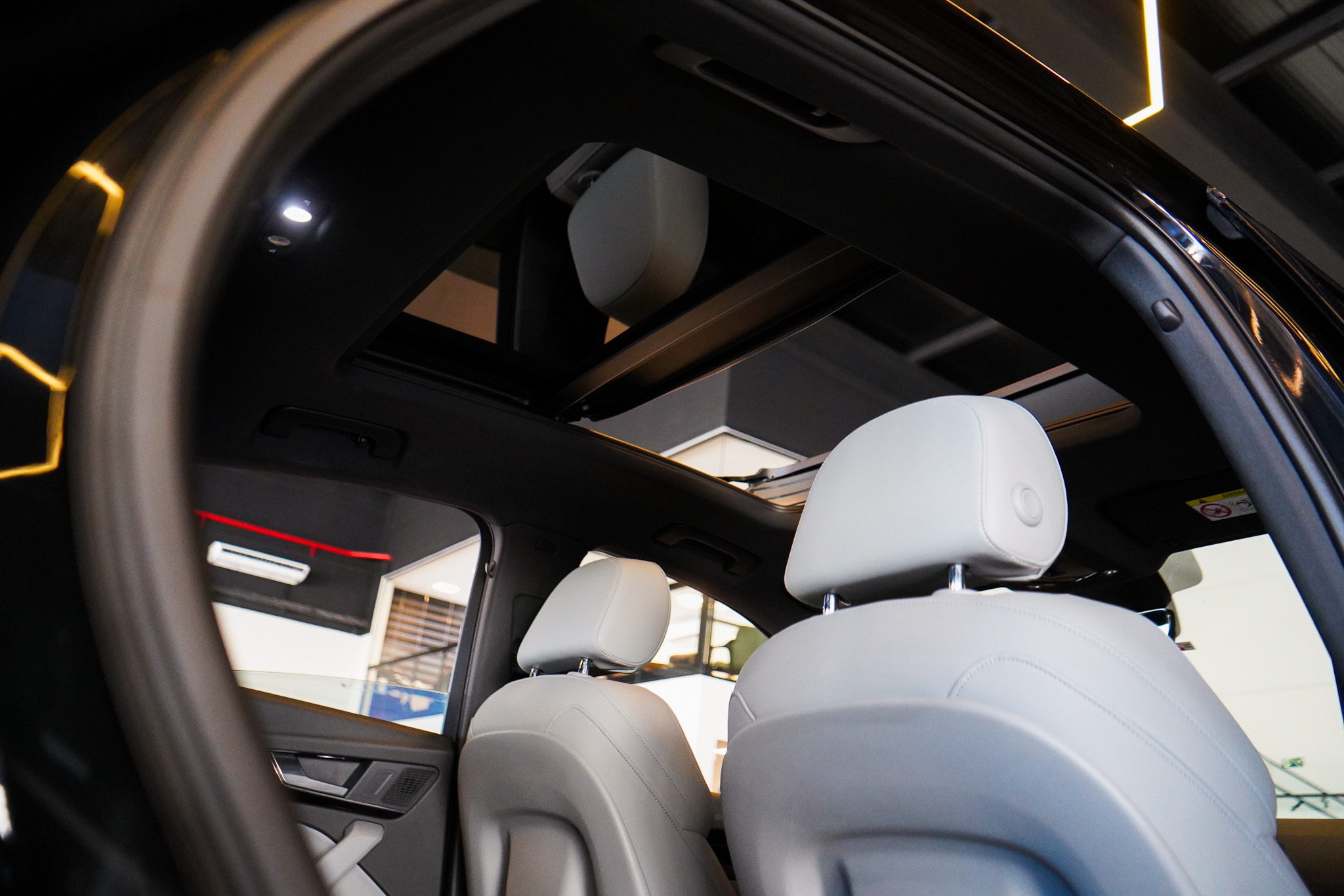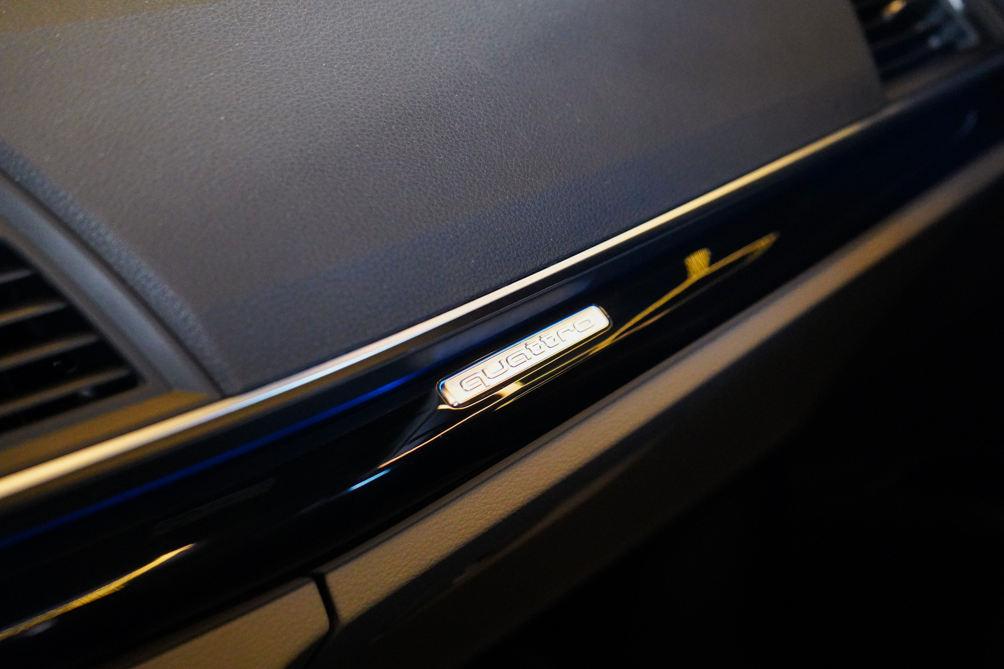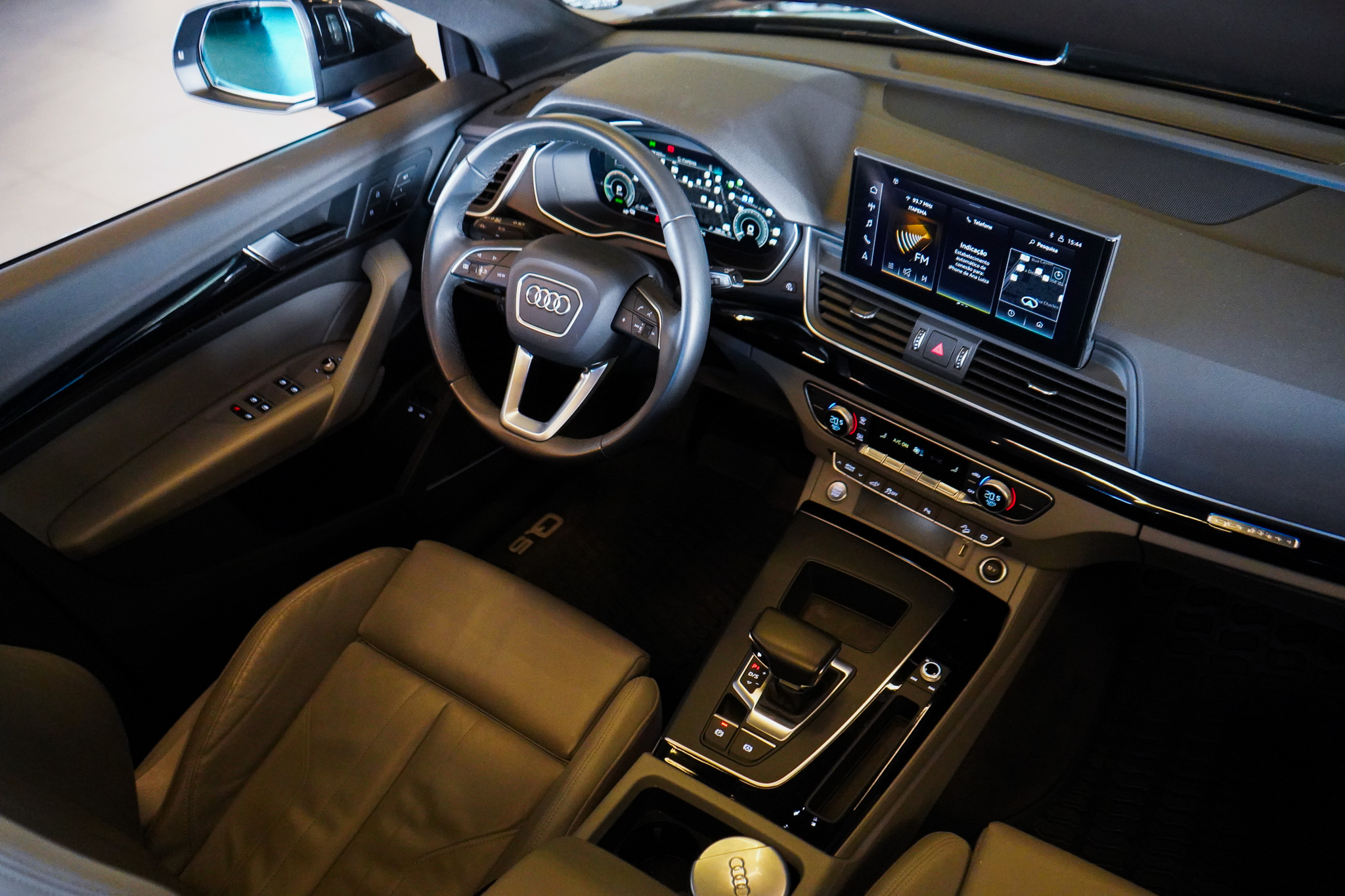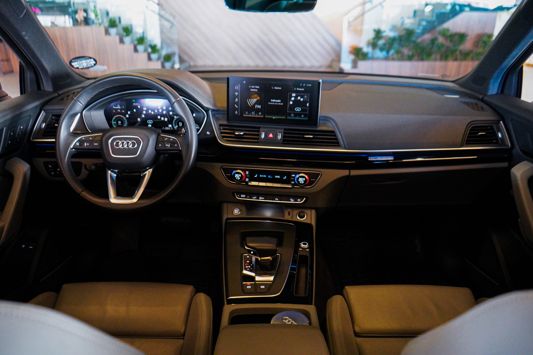 O interior reforça o padrão premium da Audi, com acabamento sofisticado e alto nível de conforto. O modelo oferece ar-condicionado automático de três zonas, bancos em couro com ajuste elétrico e memória, extensão frontal do assento do motorista, porta-copos e pára-choques na cor do veículo, teto solar elétrico panorâmico, porta-malas com abertura motorizada, chave presencial, Auto Hold e freio de estacionamento eletromecânico. Recursos como retrovisores rebatíveis eletricamente e fotocrômicos e iluminação interna refinada elevam a experiência a bordo.