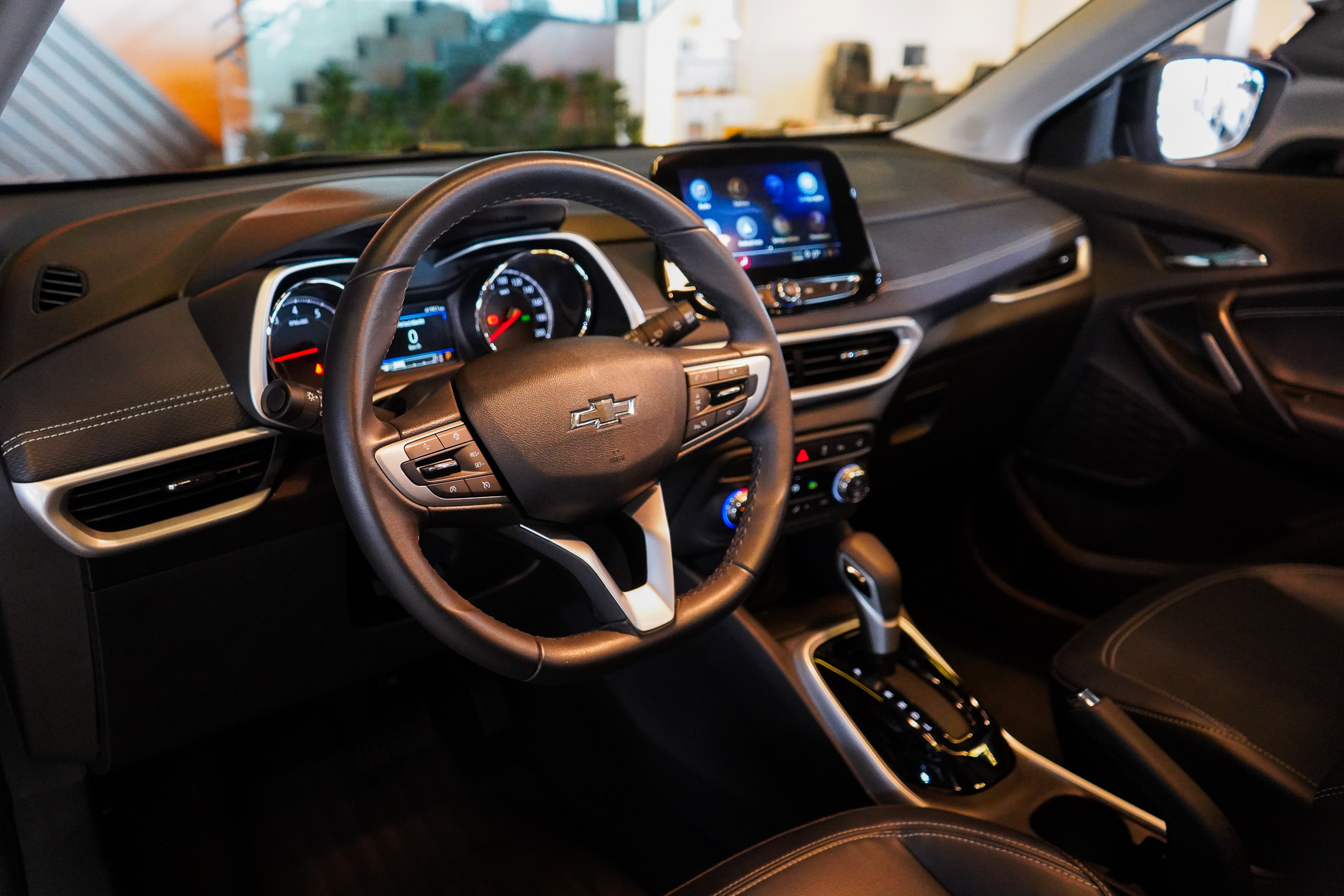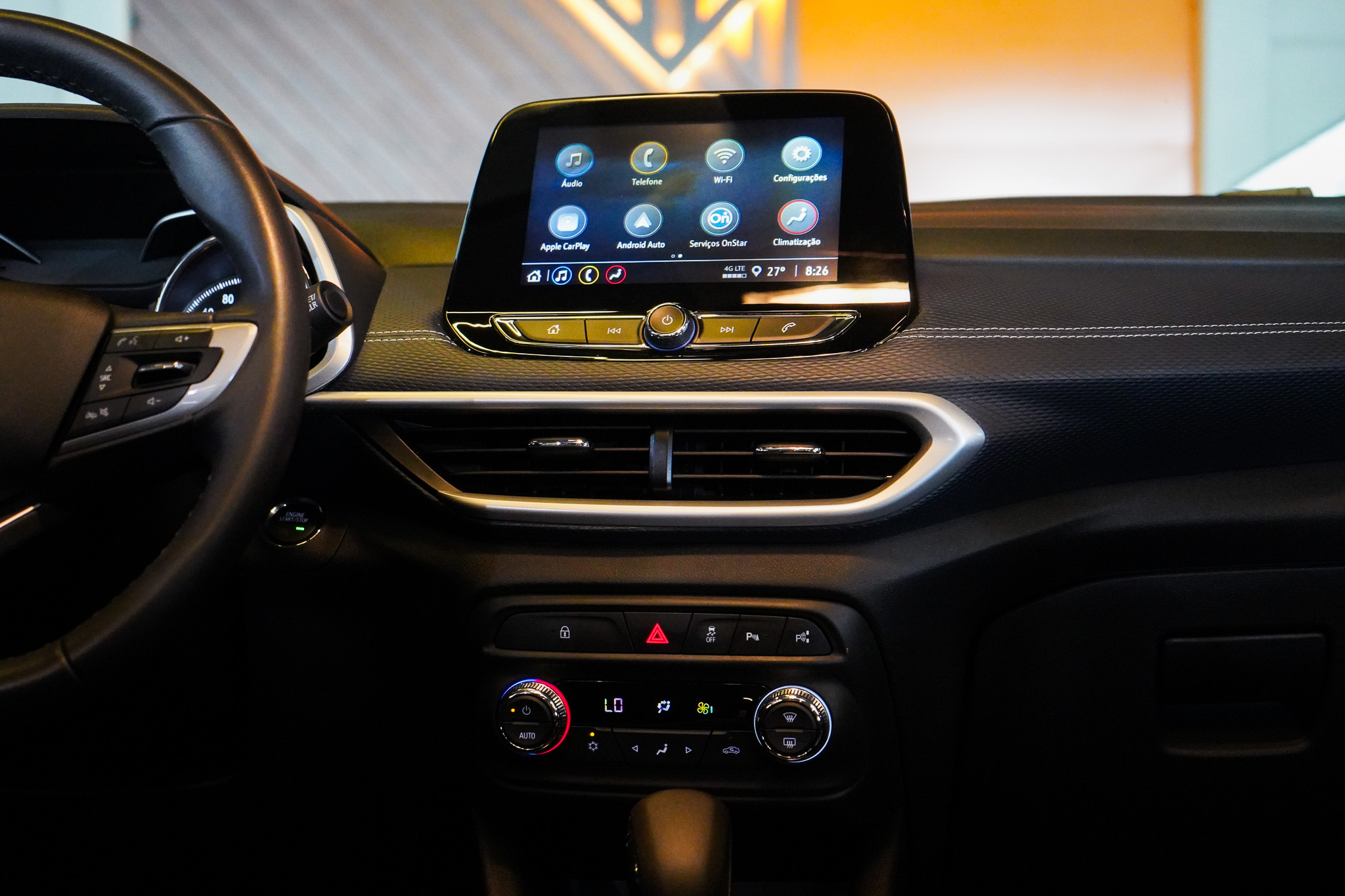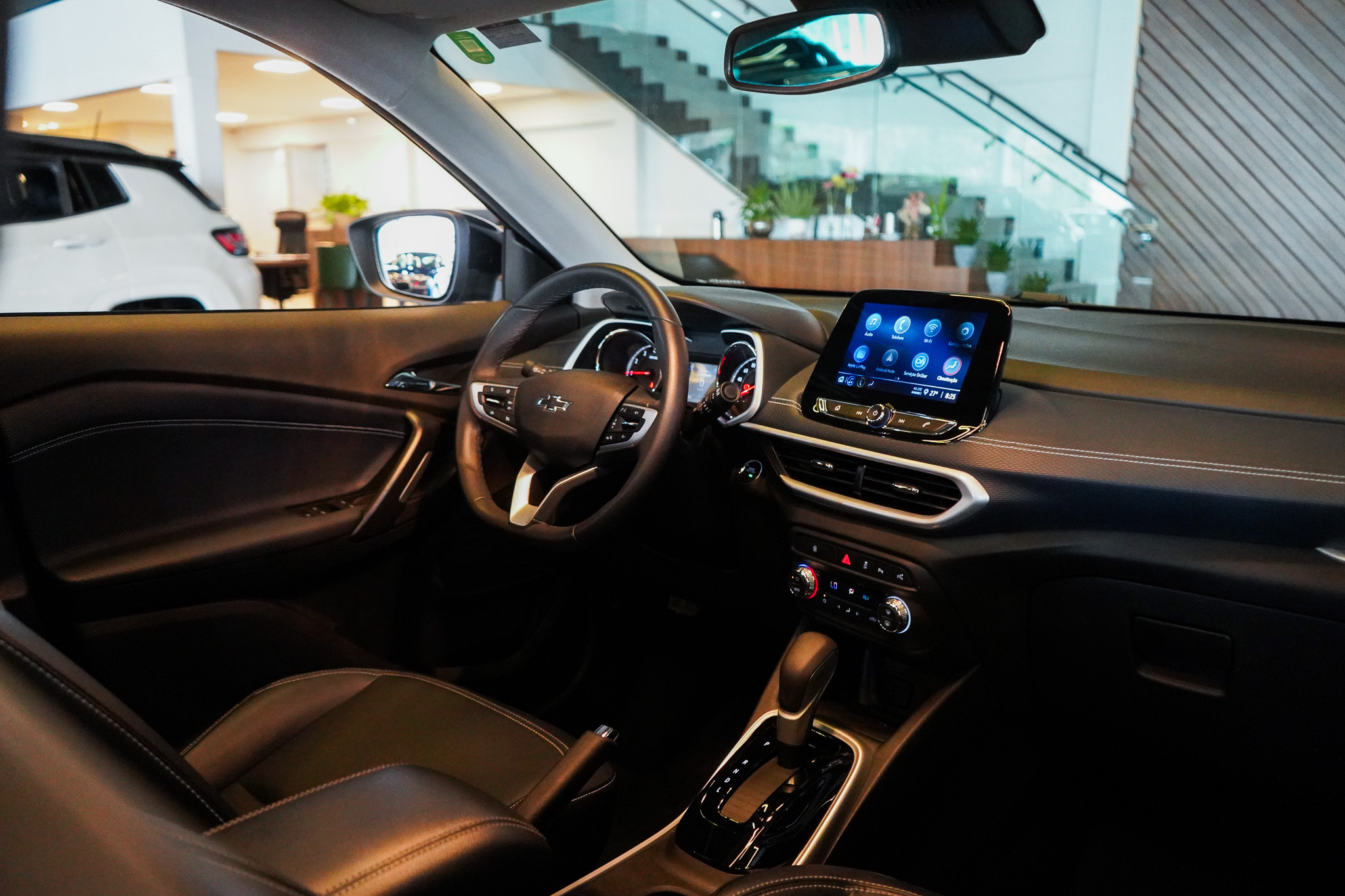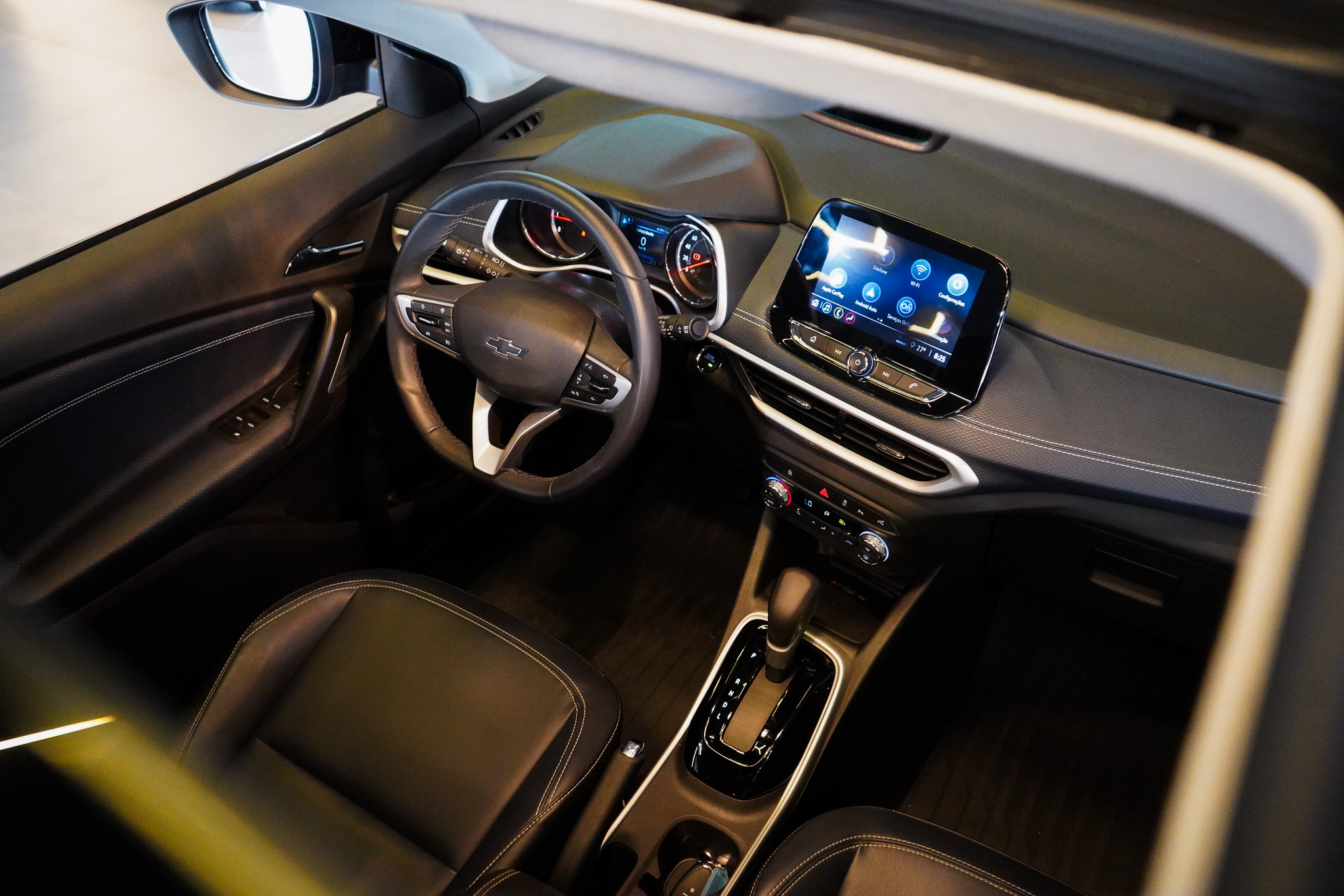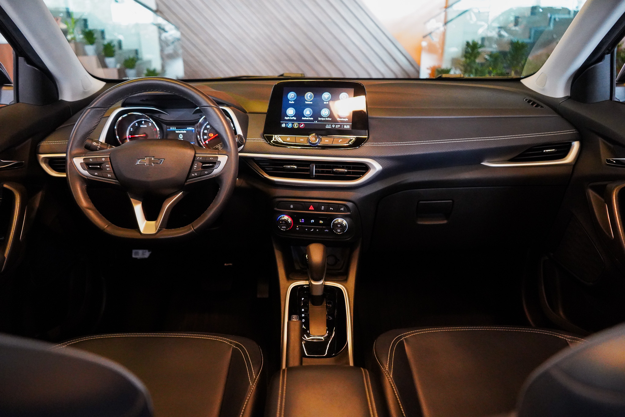 No infotainment, oferece central multimídia com espelhamento da tela do celular, Bluetooth, USB, volante multifuncional, computador de bordo, carregador de celular por indução, Wi-Fi embarcado, informações e comandos do veículo via aplicativo, tomada 12V e indicadores de temperatura externa, reforçando conectividade e praticidade.