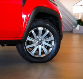O conjunto de suspensão utiliza sistema independente McPherson na dianteira e eixo rígido na traseira, com molas helicoidais na dianteira e mola parabólica de lâmina única na traseira, solução tradicional em picapes que favorece resistência e capacidade de carga. O sistema de freios conta com discos ventilados na dianteira e tambores na traseira, enquanto a direção possui assistência elétrica, contribuindo para facilidade de manobras.