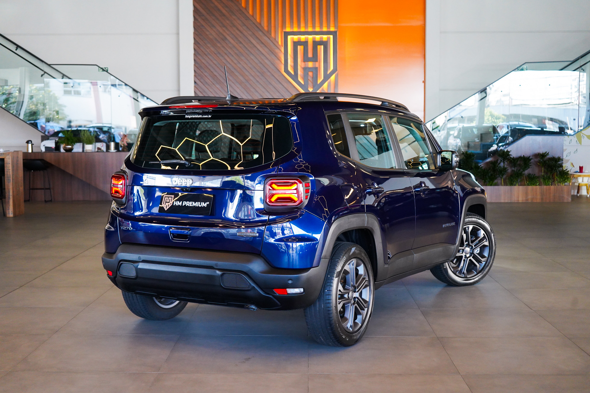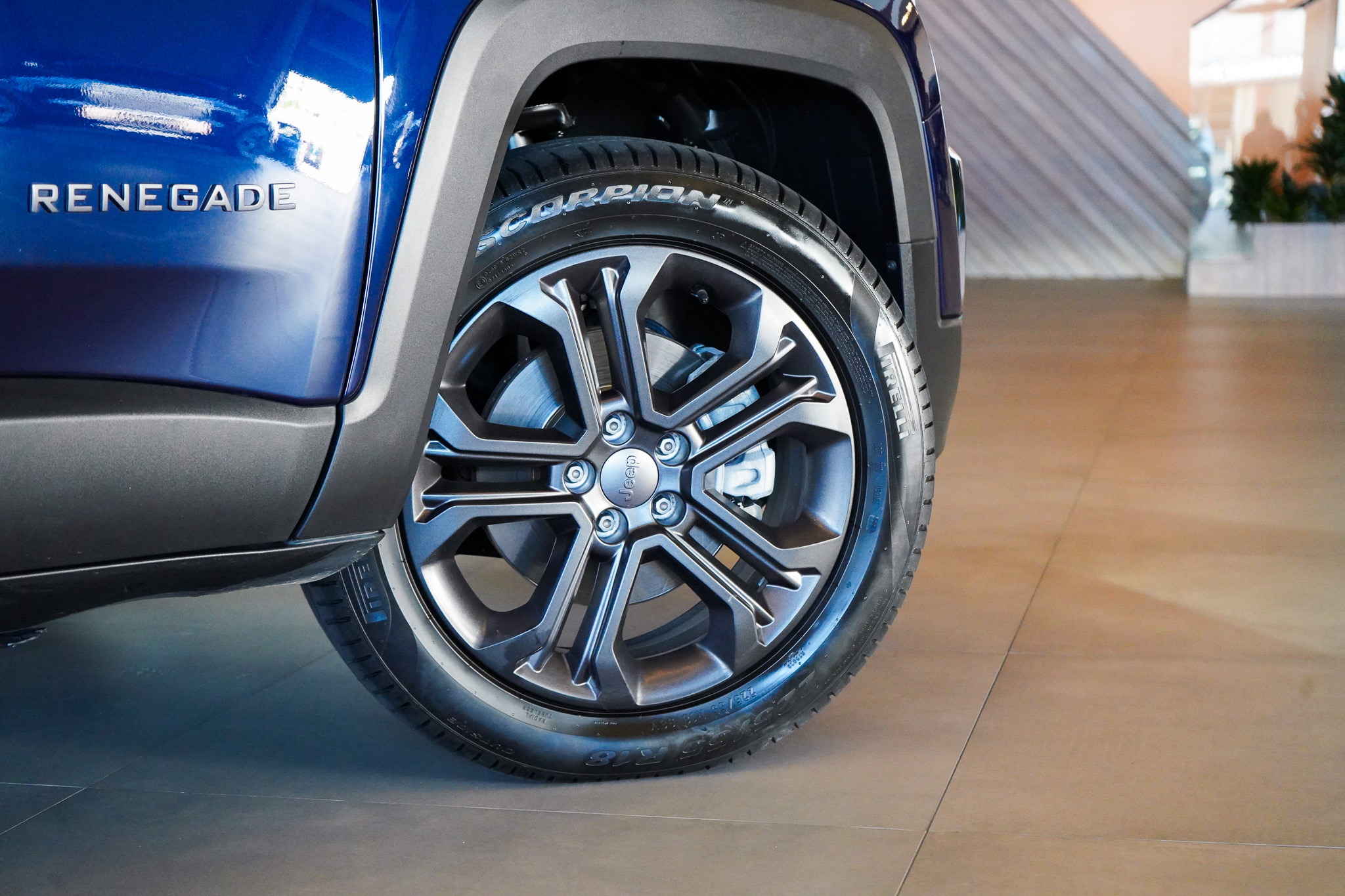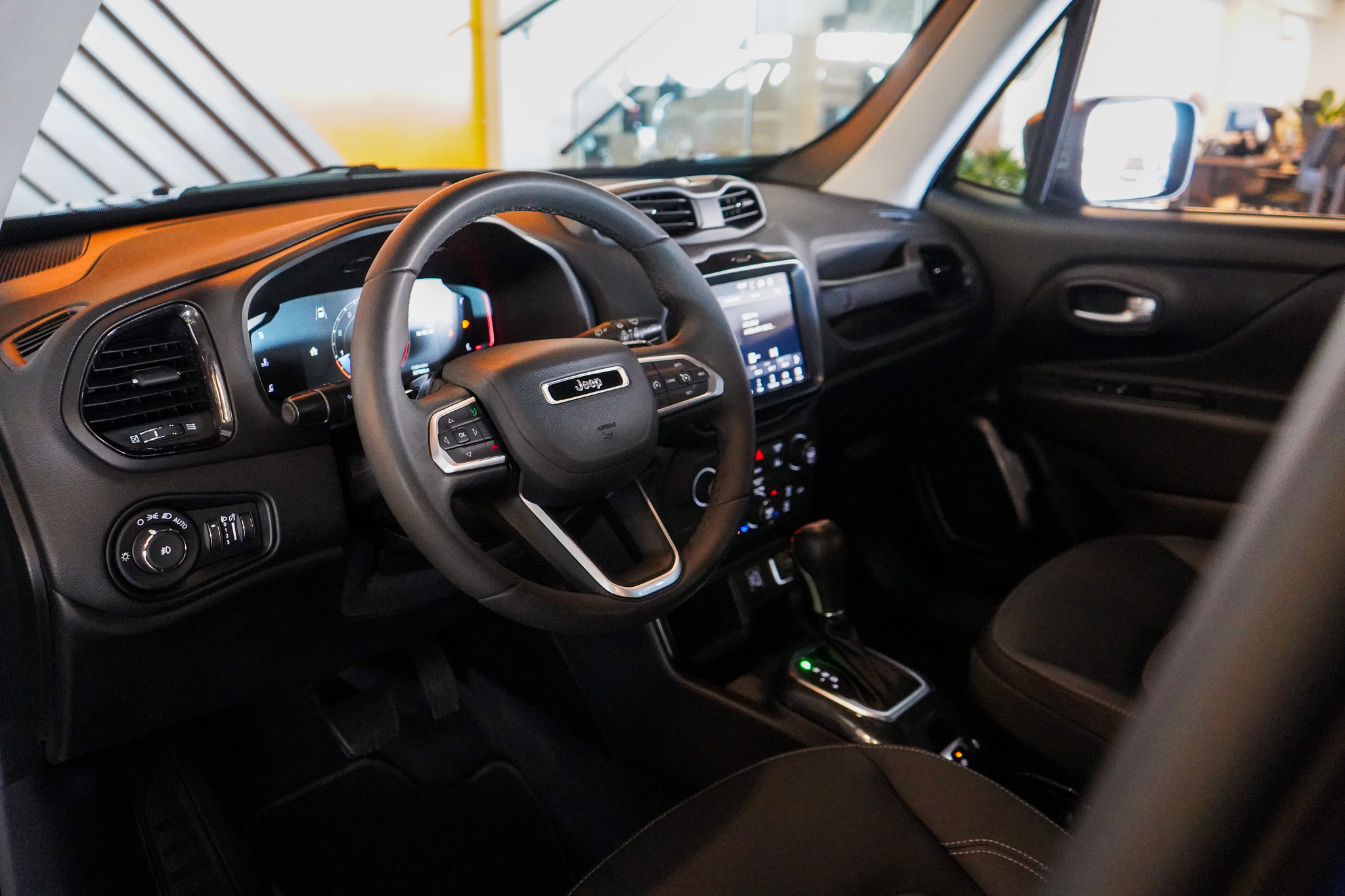 Em dimensões, o Renegade mede 4.268 mm de comprimento, 1.805 mm de largura e 1.702 mm de altura, com entre-eixos de 2.570 mm. O porta-malas comporta 320 litros, o tanque de combustível 55 litros e o peso total é de 1.476 kg. A altura mínima do solo é de 192 mm, com ângulos de entrada de 22° e saída de 32°, preservando a identidade Jeep mesmo no uso urbano.