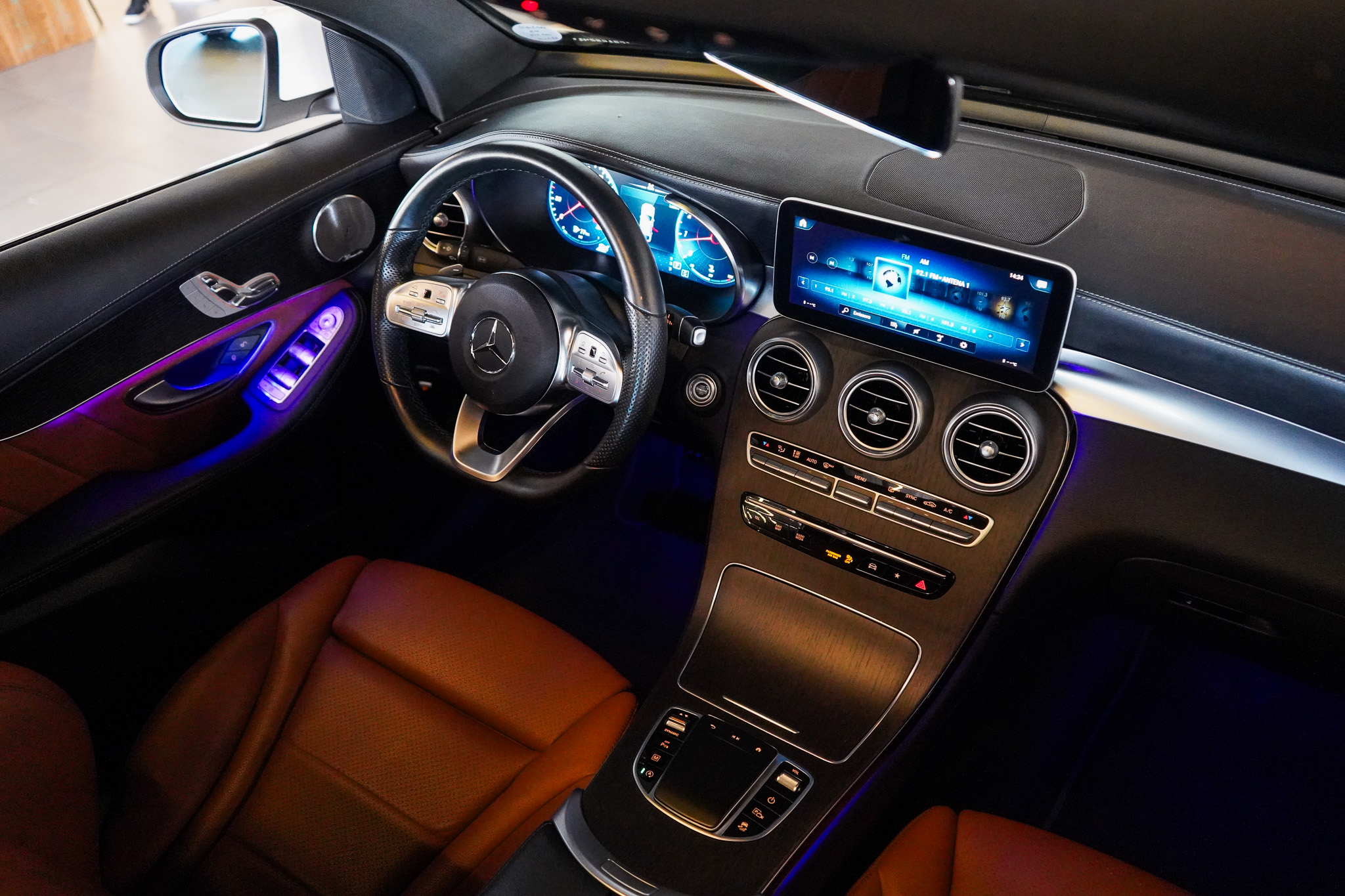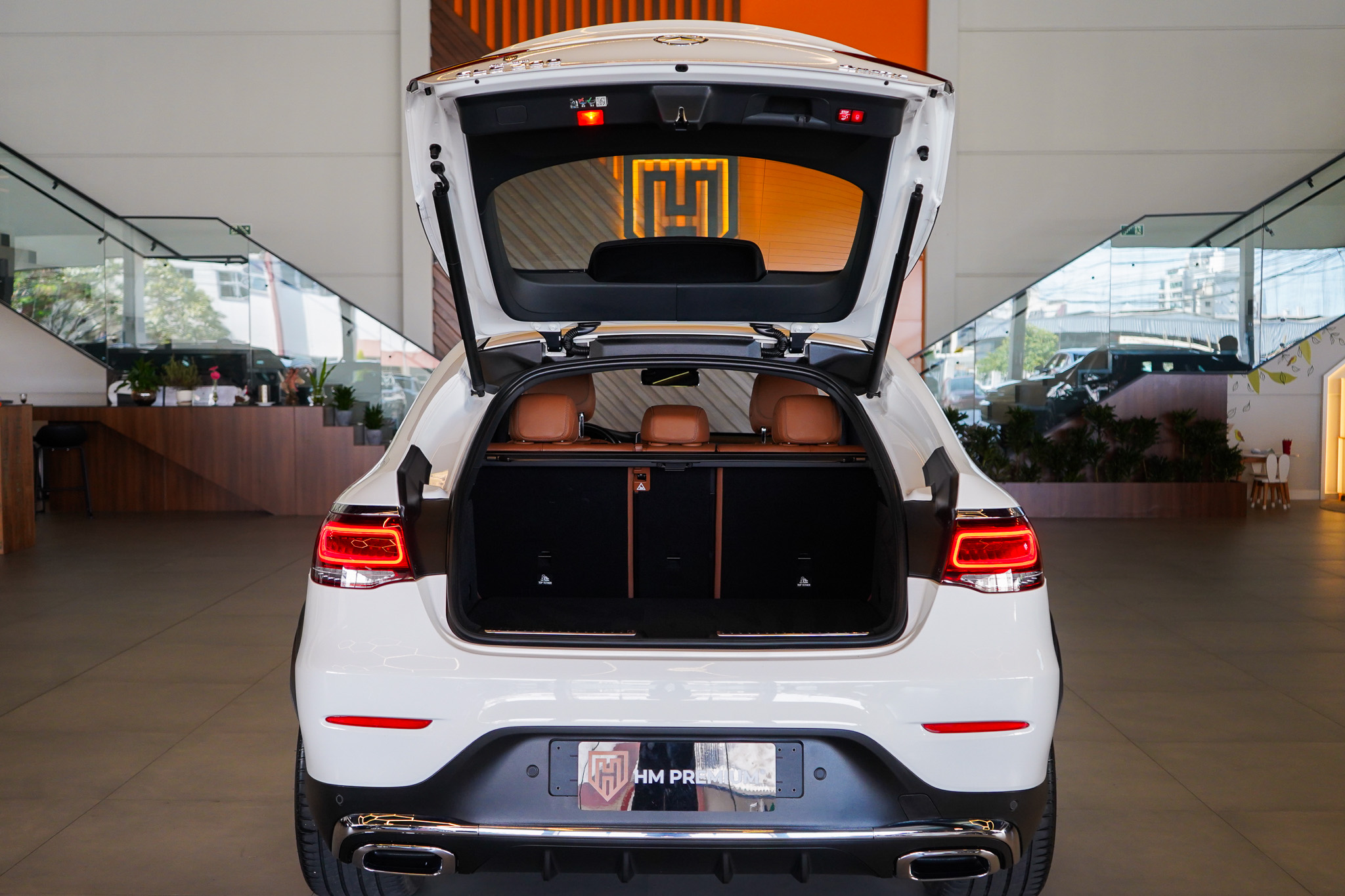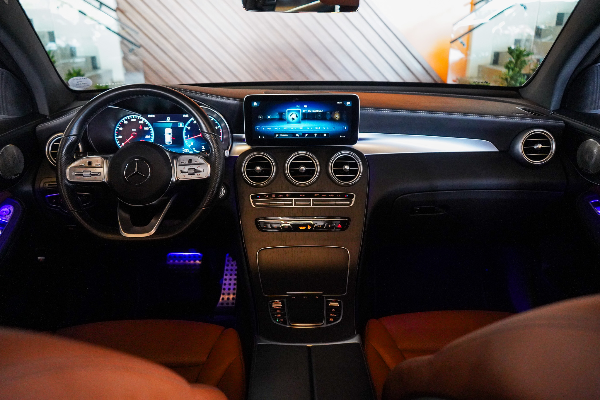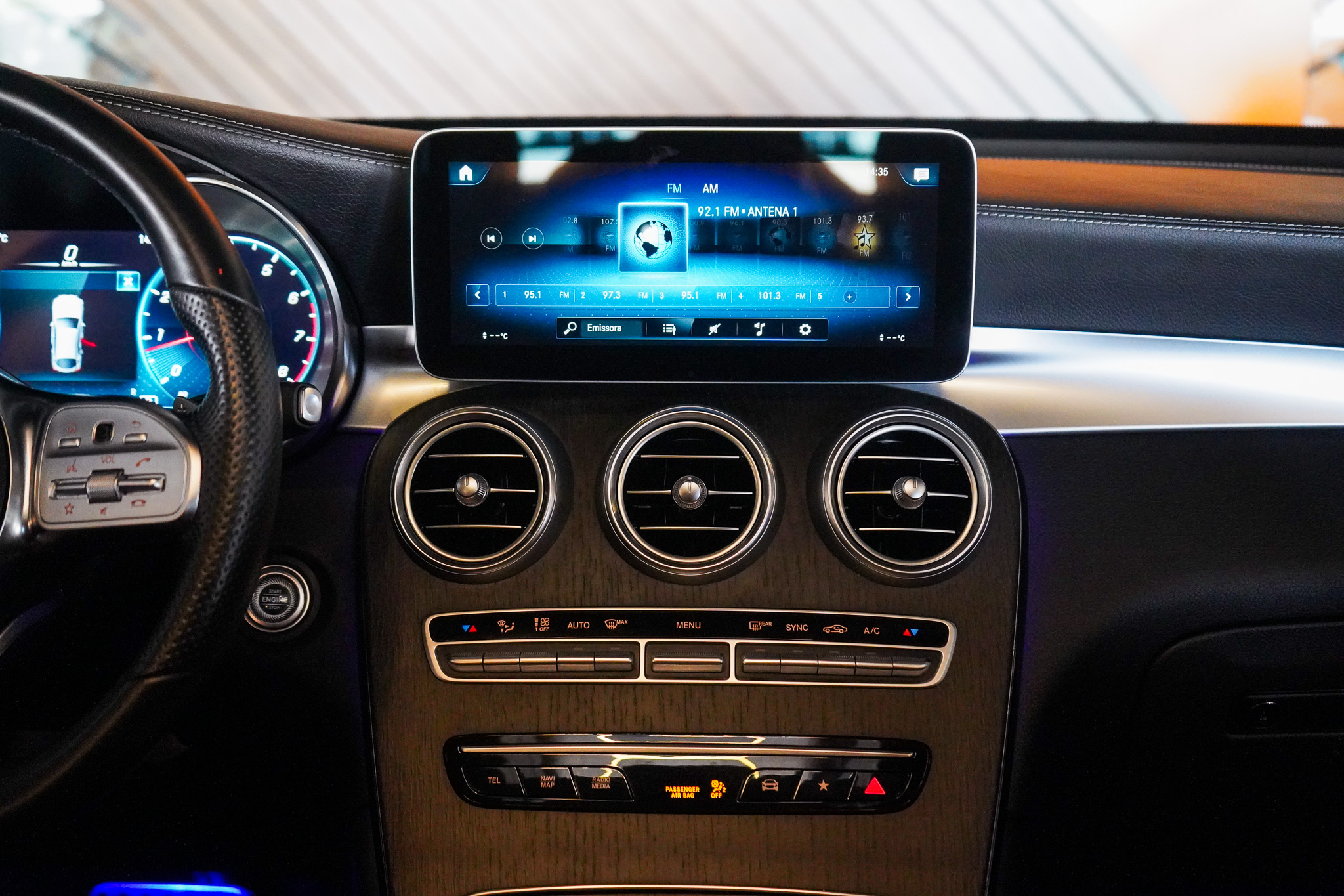 O ambiente interno evidencia o padrão Mercedes-Benz, com ar-condicionado automático digital de duas zonas, bancos em couro com ajustes elétricos e memória, teto solar elétrico, chave presencial, sistema Auto Hold, tampa traseira motorizada e acabamento refinado. A experiência sonora é elevada pelo sistema de som Burmester, enquanto a central multimídia oferece espelhamento de smartphone, Bluetooth, USB e carregador de celular por indução.