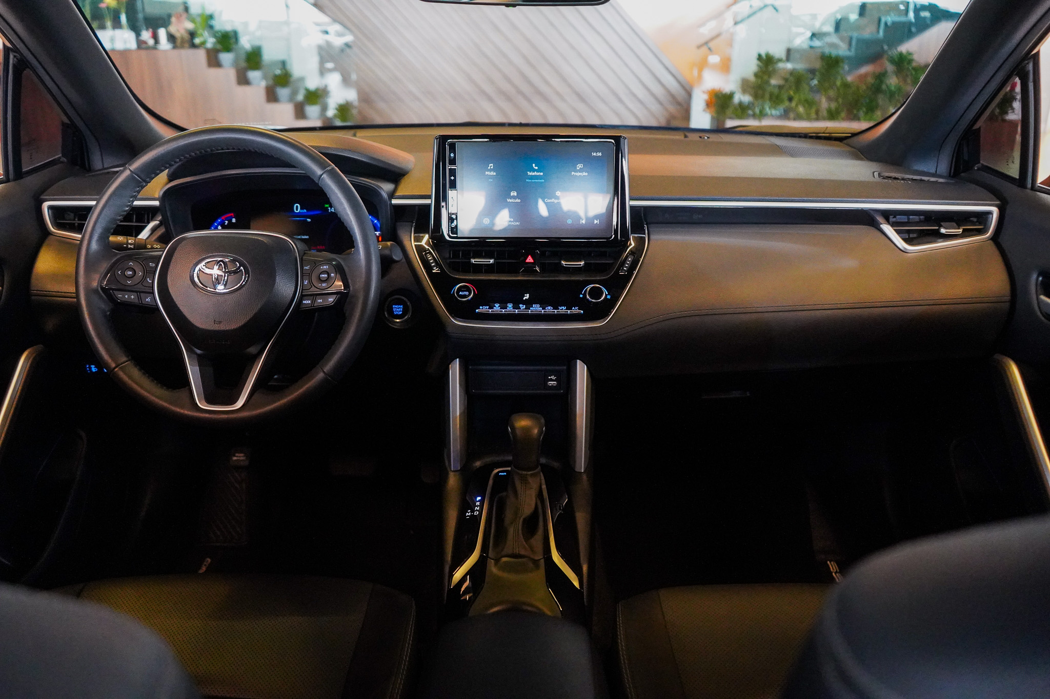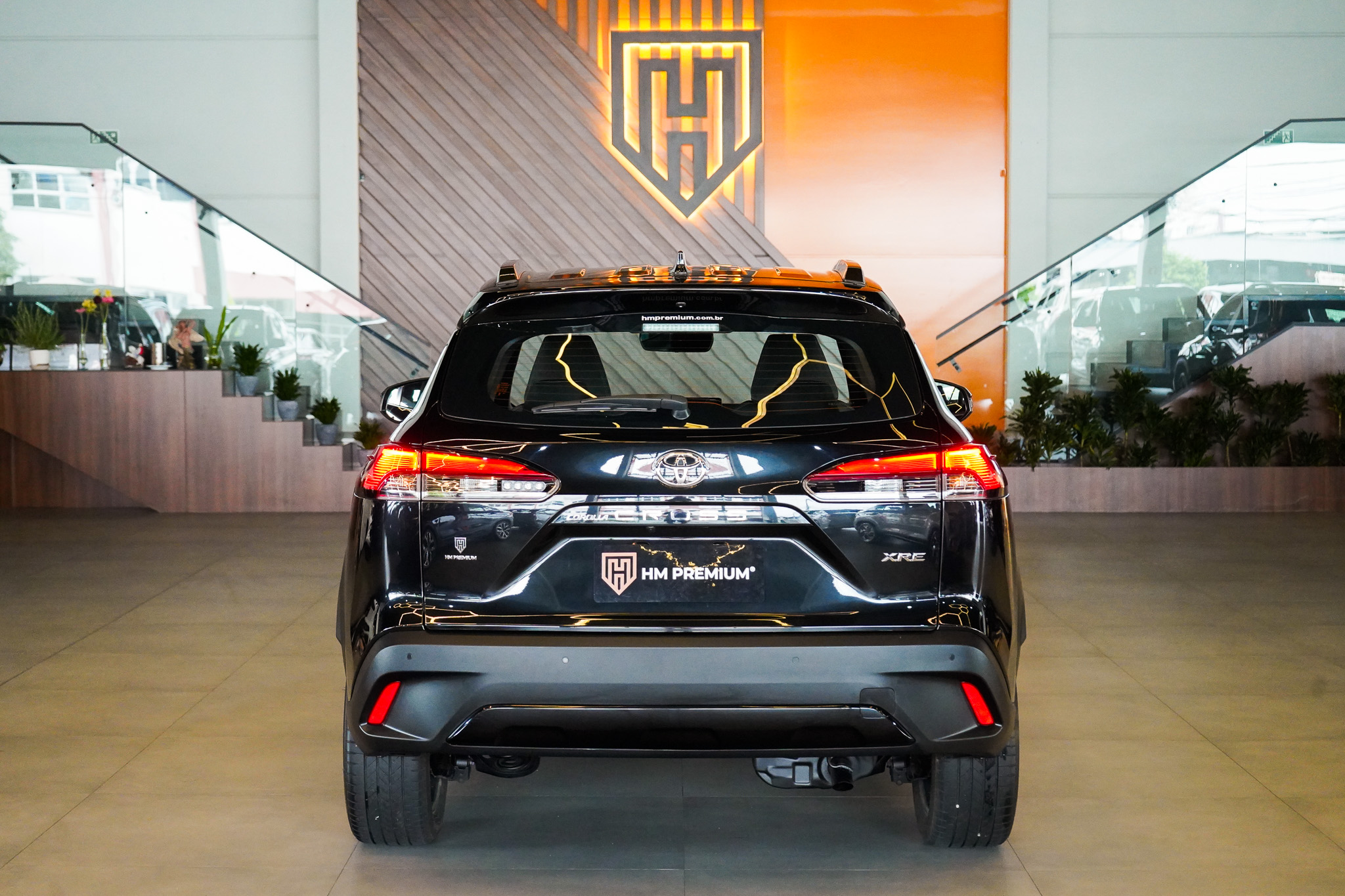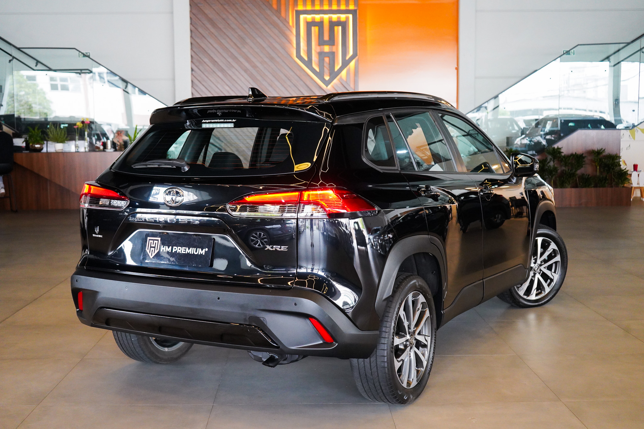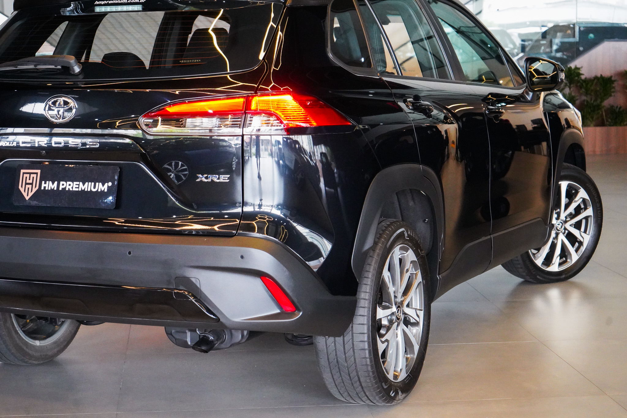Em segurança, o Corolla Cross XRE se destaca por 7 airbags, freios ABS, controles de estabilidade e tração, alerta de colisão frontal, assistente de permanência em faixa, assistente de farol alto, frenagem automática de emergência, sensores de estacionamento dianteiros e traseiros, câmera de ré, ISOFIX, assistente de partida em rampa e faróis de LED.