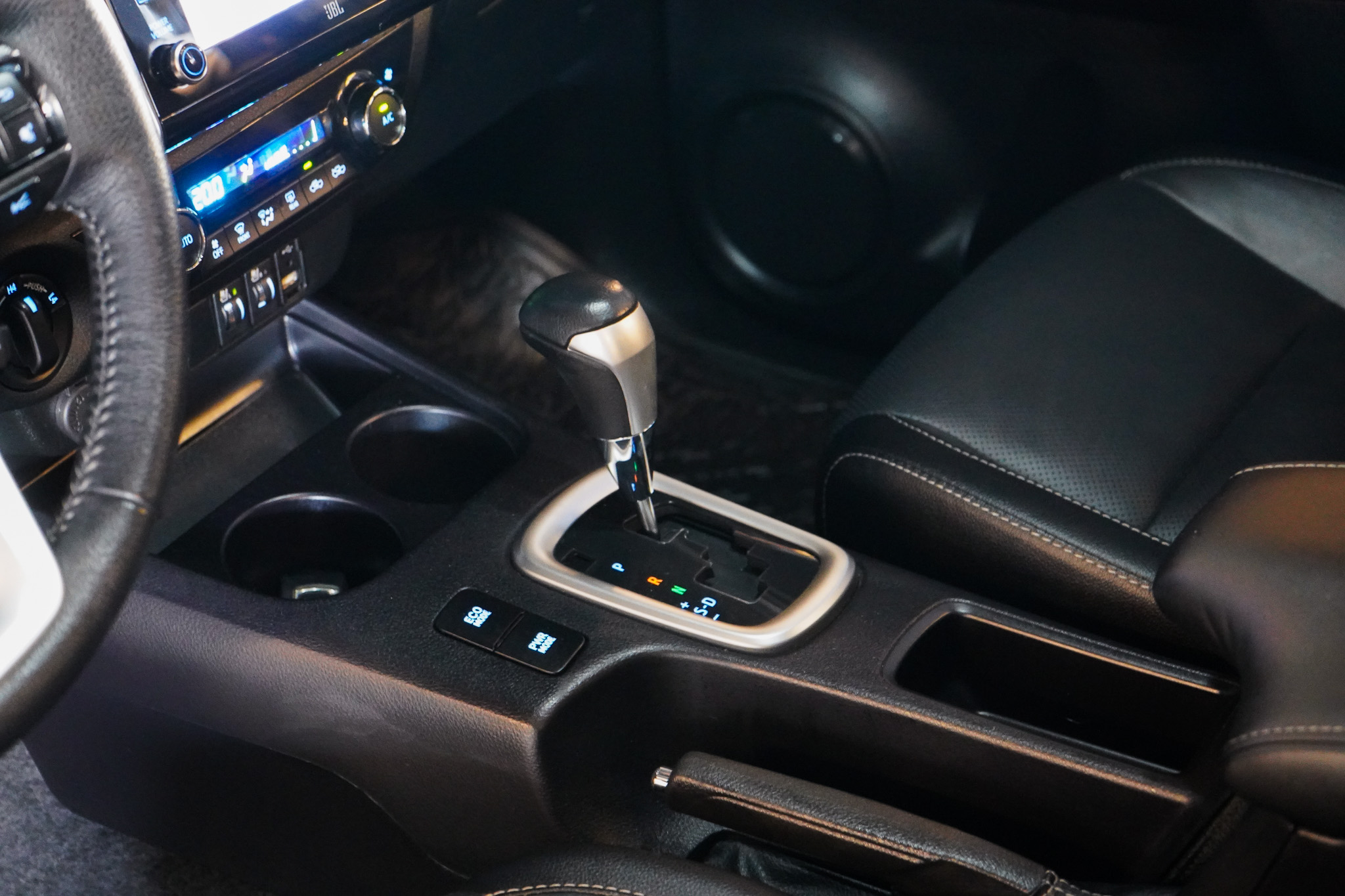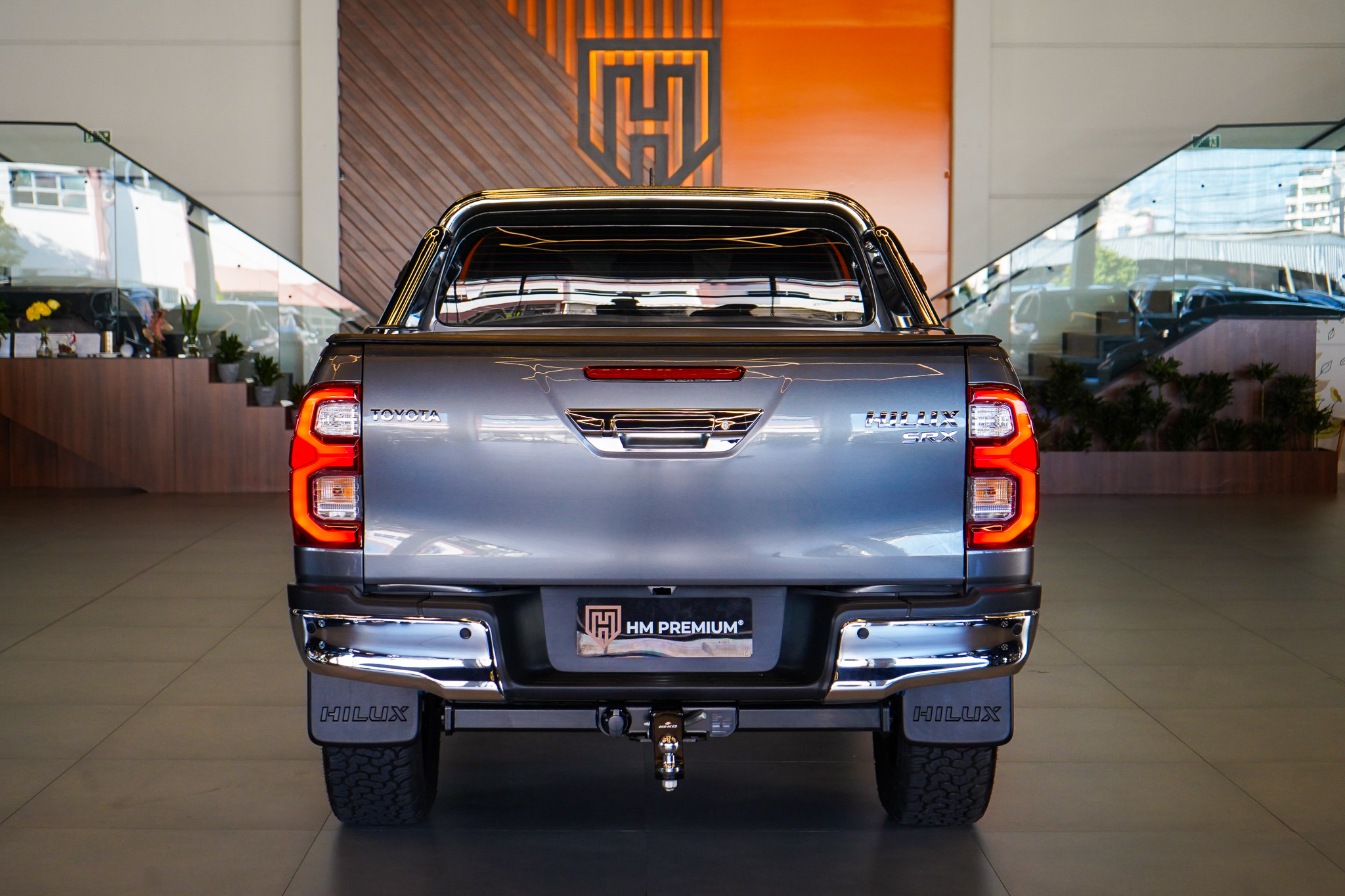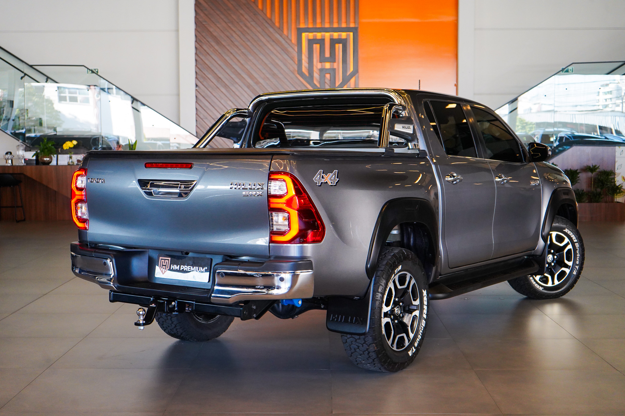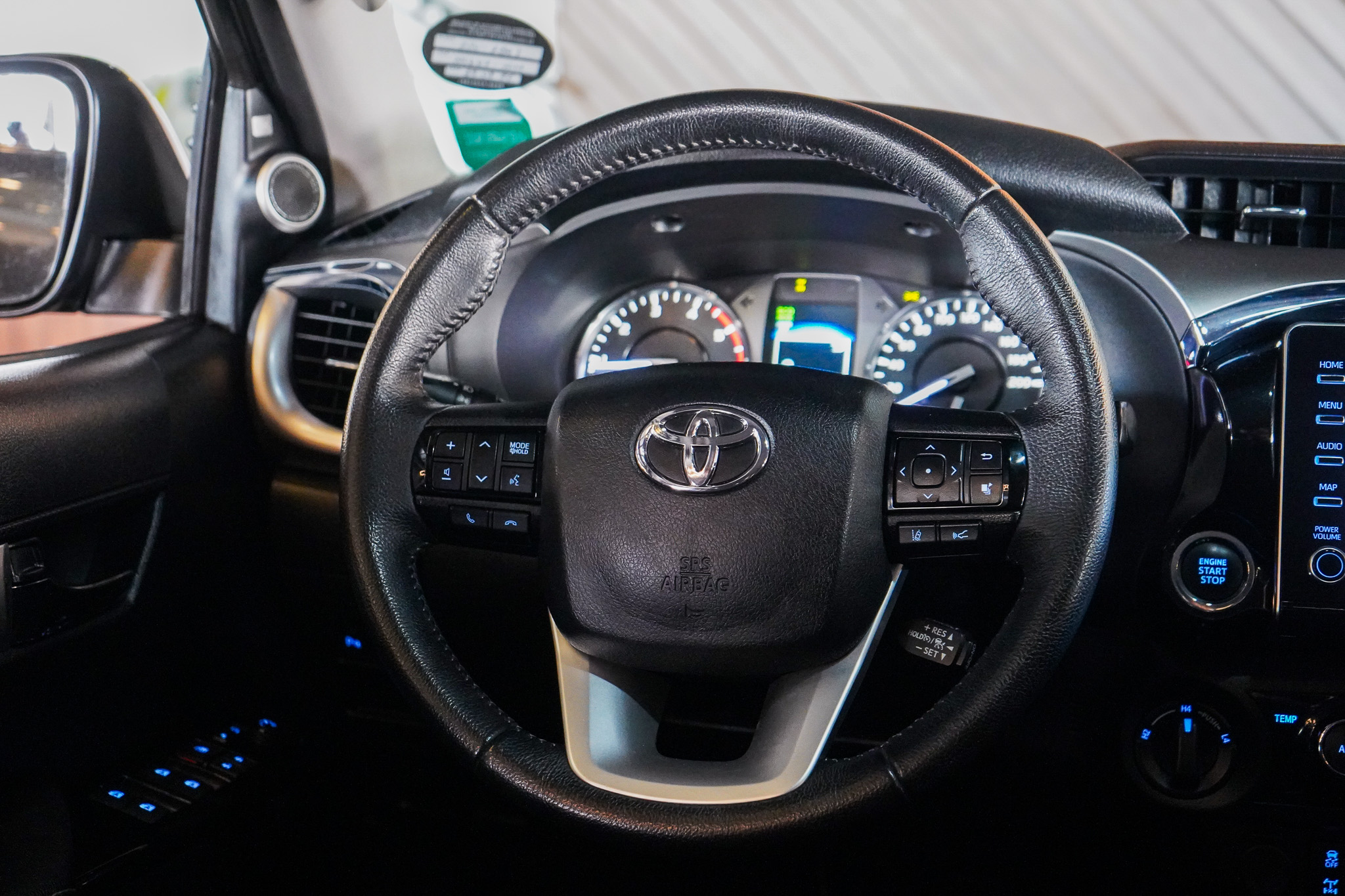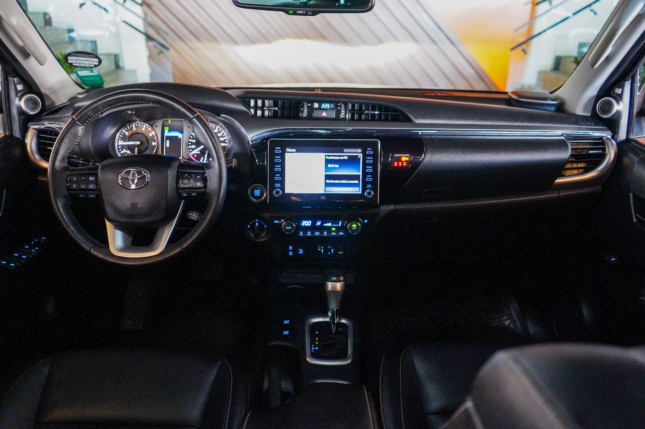 Em conforto e conveniência, a Hilux SRX oferece ar-condicionado automático, bancos revestidos em couro com ajustes elétricos e ventilação, controle automático de velocidade adaptativo, chave presencial, vidros elétricos nas quatro portas, retrovisores com ajuste elétrico e rebatimento, rodas de liga leve e console climatizado, além de banco traseiro rebatível e diversos recursos voltados ao uso diário.