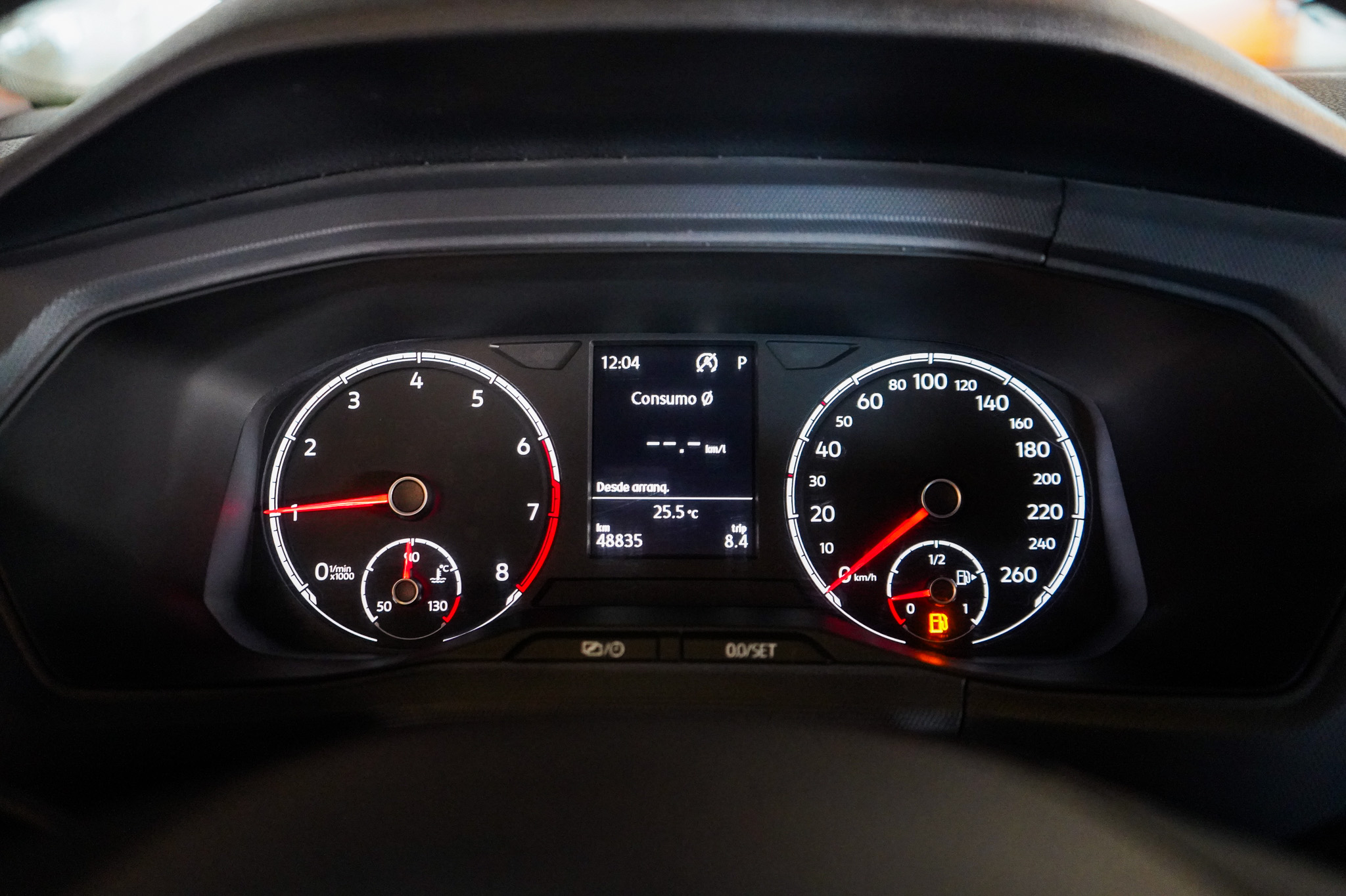 O conjunto de infotainment inclui computador de bordo, conta-giros, tomada 12V, indicador de temperatura externa e termômetro do líquido de arrefecimento, oferecendo informações essenciais ao motorista de forma clara e funcional.