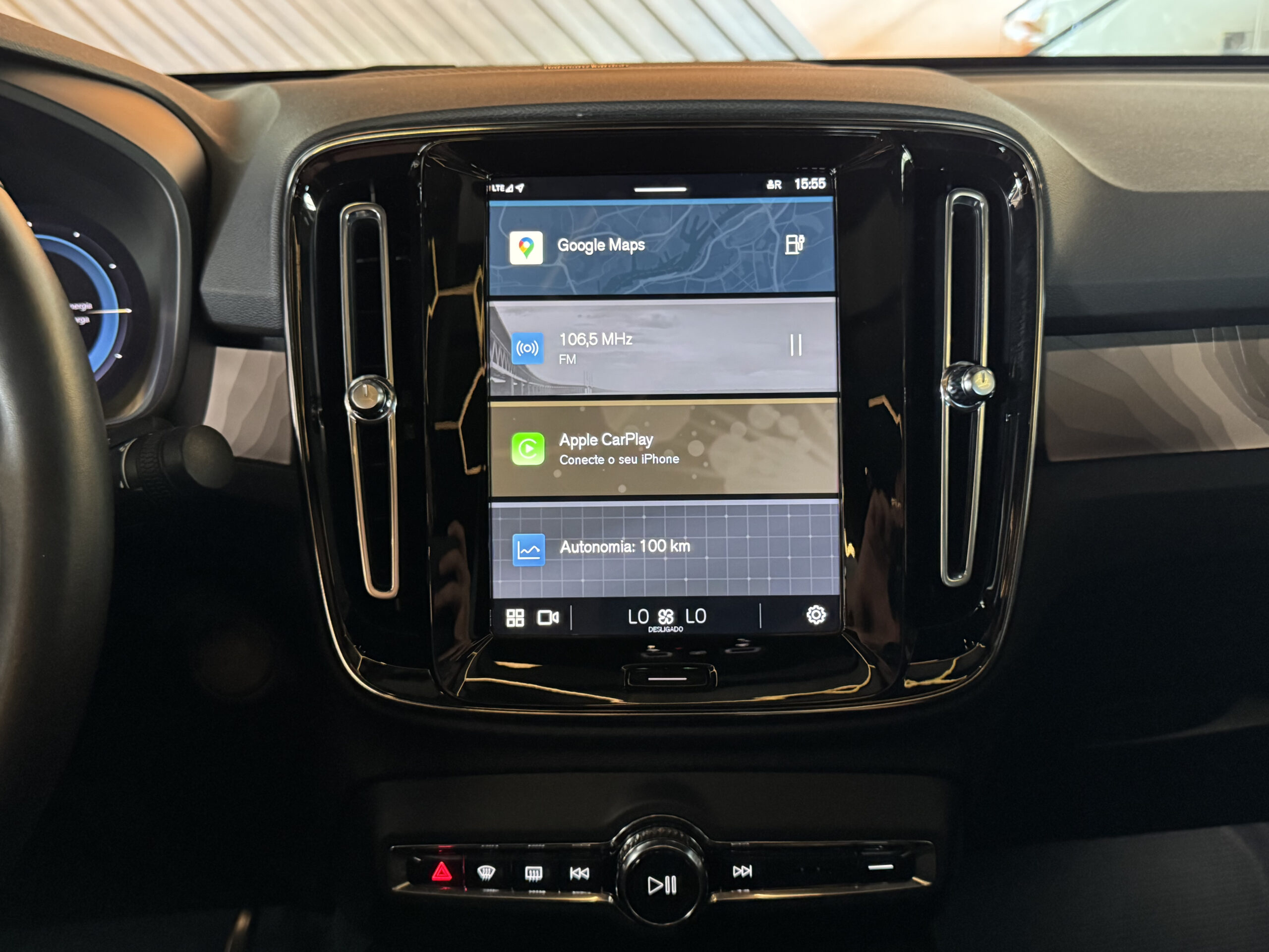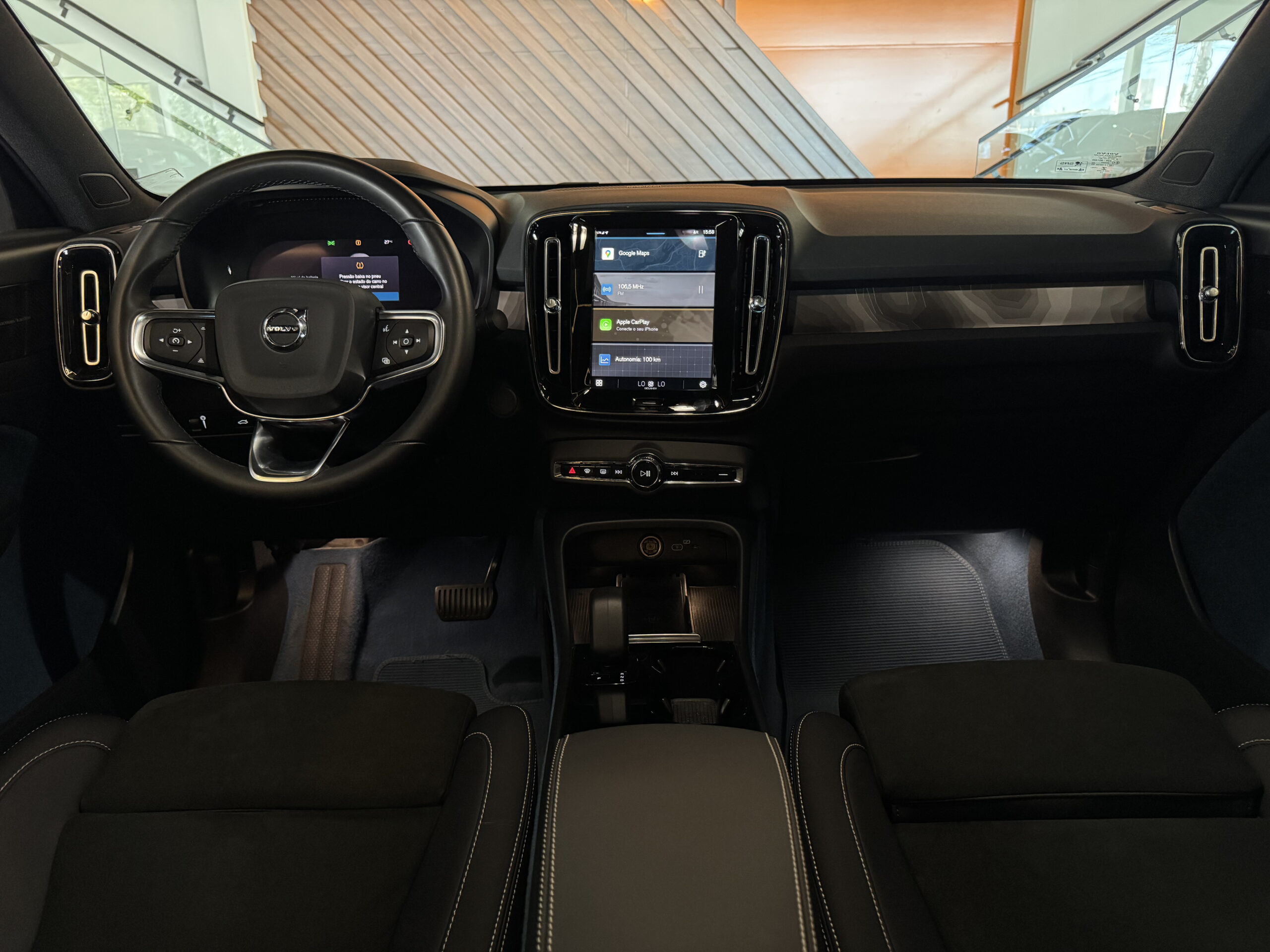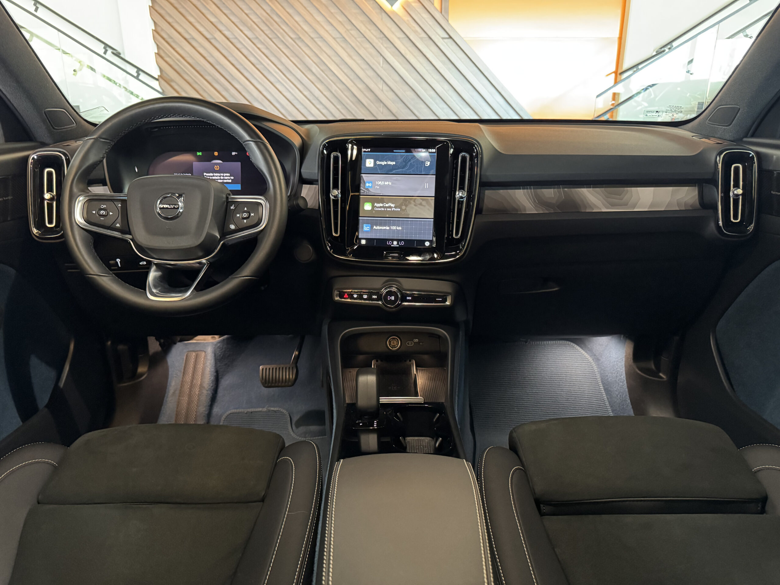 No conforto e sofisticação, o C40 Recharge oferece ar-condicionado digital automático de duas zonas, bancos revestidos em couro, banco do motorista com ajuste elétrico e memórias, banco do passageiro com ajuste elétrico, ajuste do volante em altura e profundidade, teto panorâmico, freio de estacionamento eletromecânico, Auto-Hold, porta-malas com tampa traseira motorizada, porta-objetos climatizado e chave presencial.
